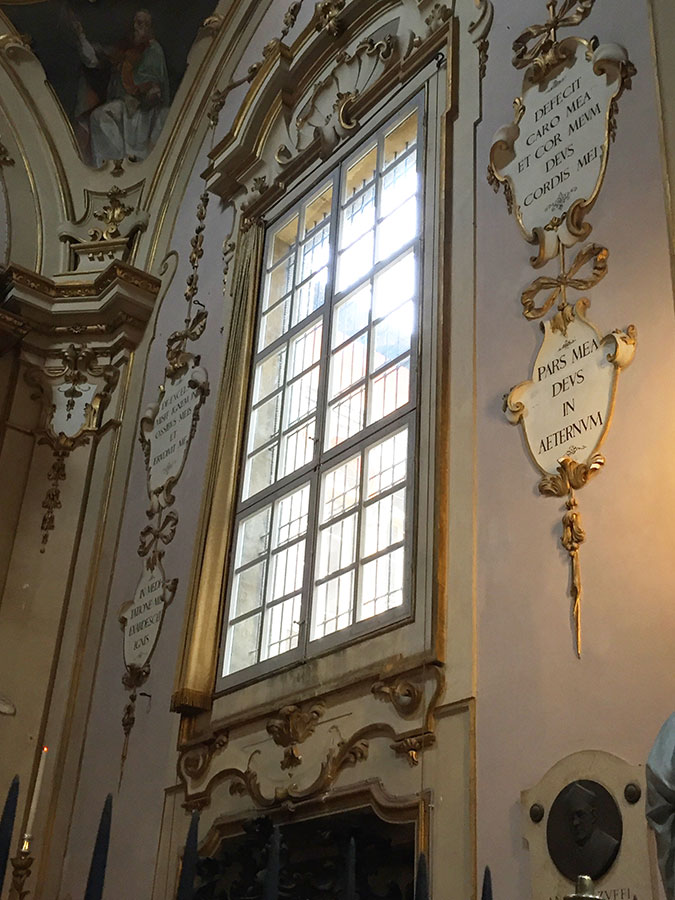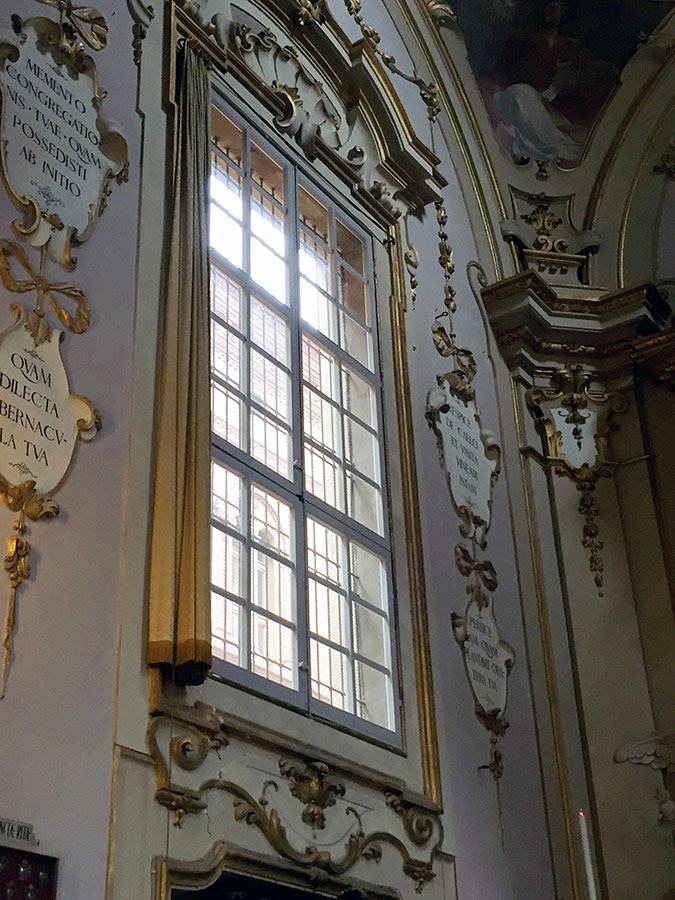 Abbiamo messo in opera una fedele ricostruzione delle finestre in stile dell'epoca (l'inizio dei lavori di edificazione della Chiesa risalgono al 1479): le finestre laterali, due rosoni e due finestre a mezzaluna. Questo intervento di fine artigianato ci ha permesso di concorrere a riportare all'antico splendore una delle bellissime Chiese del nostro territorio e di esercitare ancora tecniche di falegnameria non comuni.
